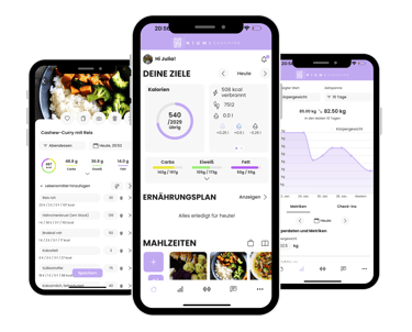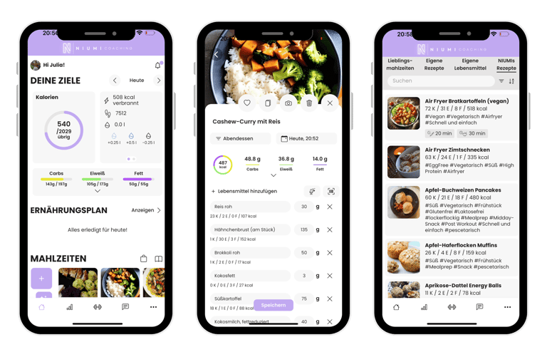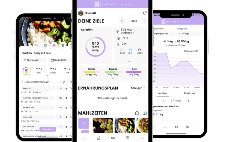 Das Light Coaching beinhaltet alle Grundfunktionen der NIUMI App (siehe unten), sowie hunderte, leckere Rezepte und verschiedenste Trainingspläne. Außerdem erhältst du exklusive Wissenslektionen, jedoch gibt es im Light Coaching keine Chat-Funktion und keine 1 zu 1 Betreuung.